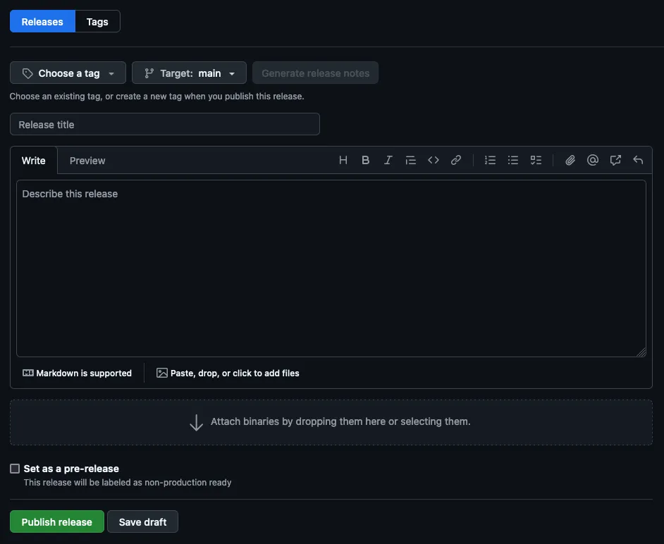 You can write release notes in a Markdown file or directly in the GitHub release interface.